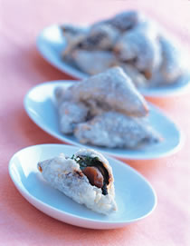 (3)取一张三角形豆皮,夹入适量馅料,将豆皮捲起,在左、右、前端都沾上面煳,捲成一三角形素捲即可,依序作好8个备用。
