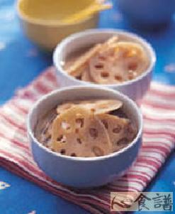 (2)将所有莲藕片放入滚水中,熬煮约30∼40分钟后,再将调味料全部放入煮溶,再用小火熬煮15分钟,留下恰可盖过莲藕的汤汁即可盛入碗中食用。
