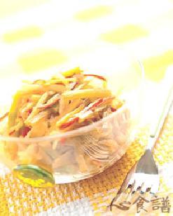 2.)将芦笋、白鹅掌与红辣椒丝、西洋芹丝拌在一起,淋上拌匀的调味料搅拌均匀入味即可。