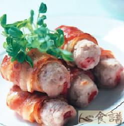 2.将培根摊平,放上入作法1捲成筒状备用。