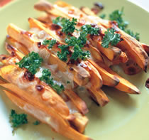 2.烤箱预热至250℃,烤盘上铺锡箔纸并涂抹少许沙拉油,放上地瓜条,入烤箱烤约6分钟后,撒上起司丝再烤约3分钟,取出撒上巴西里末即可。