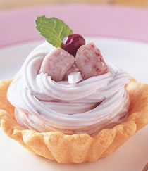 8.取出烤好的作法7待凉,用挤花袋装作法3挤在烤好的塔里,再放上作法1的芋头丁装饰即可。