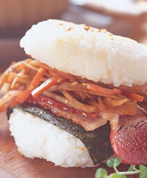 6.在其中一个珍珠饭糰依序舖上美生菜、作法3的干贝及甜豆,淋上作法4的美奶优格酱,再盖上另一个珍珠饭糰即可。