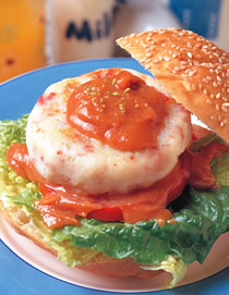5.将汉堡饱烤上色,对切成两半,涂上奶油后,依序舖上美生菜、番茄片及作法4的马铃薯饼,淋上田乐味噌酱,洒上少许的柠檬皮屑,再盖上另一半的汉堡饱即可。