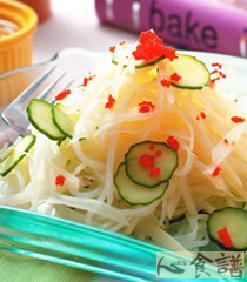 5.将作法4的马铃薯丝捞起并沥干水份后,再加入作法2的小黄瓜片一起拌均匀后盛盘。