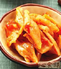 3.将作法2的菜脯洗净、切长条状,以开水再洗过,加入所有调味料b拌匀,装入瓶中约1天即可。