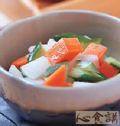 小白萝卜200公克,胡萝卜100公克,小黄瓜65公克,盐35公克,辣椒2支,白醋65㏄,糖70公克