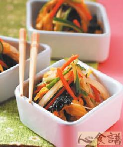 海带芽60公克,金针35公克,胡萝卜45公克,洋葱30公克,小黄瓜45公克,嫩姜20公克,盐4公克,糖3公克,香油10㏄,黑醋8㏄