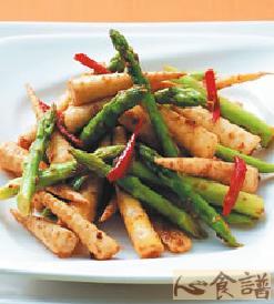 3.热油锅,先将肉丝、辣椒丝翻炒至熟,再放入作法2的芦笋段、箭笋及所有调味料,翻炒至匀即可。