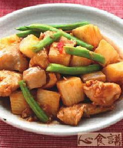 3.炒锅控净油,加醋及糖水,烧开后再倒入山药块,用面粉80克(面粉50克加水)使汁收浓,裹匀山药块,即成。