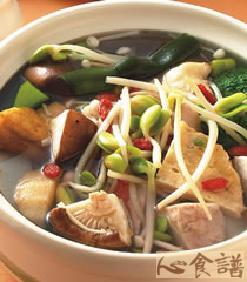 牛蒡1支,马铃薯1粒,白萝卜1条,红萝卜1条,山药1条,黄豆芽300公克,海带结110公克,菱角75公克,三角豆干6个,鲜香菇3朵,绿花椰菜1粒,素高汤6杯,盐1茶匙