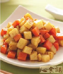 4.将作法3加入水及剩余的调味料,煮至红萝卜丁与马铃薯丁变干,起锅盛盘即可。