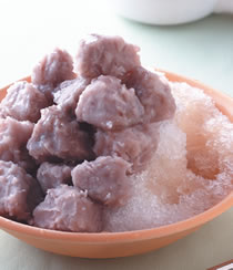 4.将大冰块放入剉冰机中,刨出1盘清冰,再放上作法3的蜜芋头,淋上糖水即可。