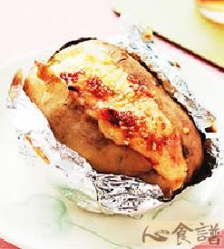 1.马铃薯洗净,包上一层铝箔纸,移入预热好的烤箱,以150℃烘烤约40分钟至熟,取出备用。
