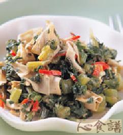 雪里红300克,百页豆腐皮50克,姜10克,辣椒1条,a.盐1/2茶匙,糖1茶匙,味精1/2茶匙,b.高汤2大匙,香油1大匙