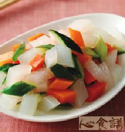 1.白萝卜、红萝卜去皮切小菱形块;小黄瓜切菱形块。