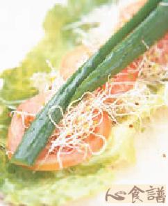 1.莴苣、豌豆苗洗净;蕃茄洗净切片;葱洗净,切去头尾;小黄瓜对切再对切备用。