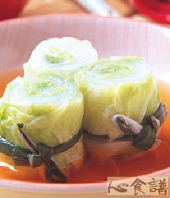 白菜叶12片,韭菜8条,寿司竹帘1张,太白粉水适量,鸡高汤400㏄,鲜美露27㏄,米酒18㏄,盐少许