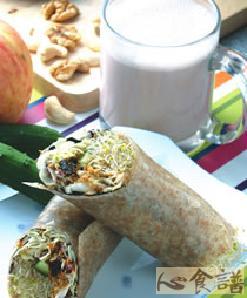 全麦蛋饼皮一张,苜蓿芽1/2碗,小黄瓜半条,红萝卜半条,高丽菜丝20公克,苹果1/4颗,岩烧海苔1张,素坚果香松粉1大匙,三宝粉1大匙,芝麻粉1小匙,低脂沙拉酱少许