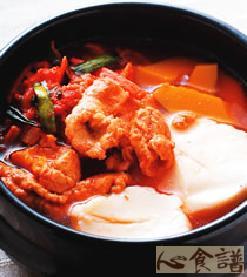 猪肉片50公克,泡菜汁3大匙,南瓜50公克,韩国泡菜150公克,牛骨高汤2000㏄,洋葱末1大匙,豆花200公克,酱油1大匙,姜泥1茶匙,麻油1大匙,盐1/2茶匙,细砂糖1茶匙