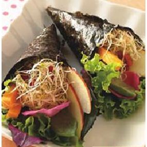 2.取一张海苔片铺上适量作法1材料,再撒上少许材料b的坚果粉、葡萄干以及枸杞干,捲起成手卷状即可。