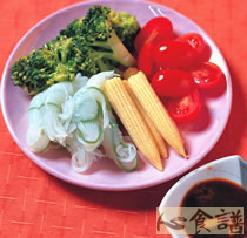 2.芥末酱中加上少许酱油调匀后,将它淋在作法1的玉米笋、绿花椰菜、蒟蒻素小卷上即可。