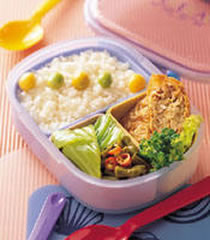 (5)将白饭盛入便当中铺平,上面放黄果及青豆仁装饰即成。