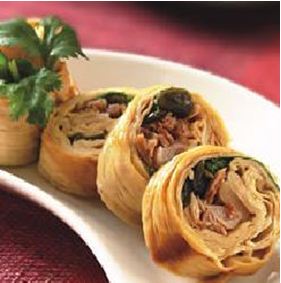 3.取三片作法1的半圆形腐皮对摺,在每层间都刷上调味料a,再把作法2内馅包入腐皮中捲成条状,摆在盘子上并覆上保鲜膜,再移入蒸笼以大火蒸煮约5分钟后取出放凉备用。