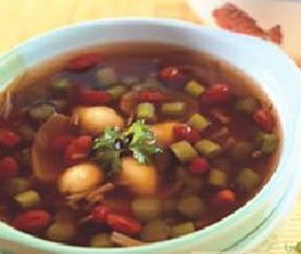 仙草茶500cc,新鲜百合1/2朵,白果1大匙,枸杞1大匙,芦笋6根,金针菇1/4包,香菜少许,盐1小匙,太白粉水1杯