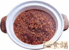4.取一砂锅,倒入作法3的材料,再加入高汤煮滚,煮滚后转小火并盖上锅盖,续煮约1小时后加入作法2的红葱酥,再煮约10分钟即可。