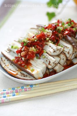 剁椒80克,茄子150克,盐、鸡精各3克,香油、辣椒油各10克,红油15克,葱丝5克,熟芝麻3克