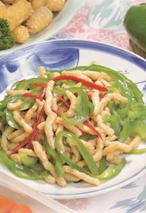 主料:青椒2个,辣椒2根。素肉丝150公克。盐,味素各适量,太白粉适量,香油少许。