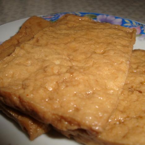 2、锅里放适量油,七成热时,下入素鸡片,正反面煎制金黄色后关火,盛出来把油沥一下。