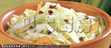 4:海白菜丝码在娃娃菜丝上 撒上蒜末 干辣椒丝 白胡椒粉 淋上生抽 麻油拌一下即可