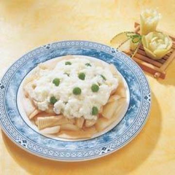 荸荠(马蹄)160克,鲜竹笋80克,鸡蛋清4个,食油21/2汤匙,牛奶120毫升,太白粉(生粉)11/2茶匙,嫩豌豆1汤匙,香菜(芫荽)1棵,盐3/4茶匙,糖3/4茶匙,胡椒粉少许