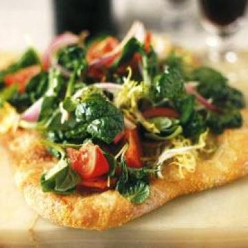 比萨面团450克(如是冷冻的面团,置于室温下解冻),黄玉米(粟米)粗粉(cornmeal)2汤匙,磨碎的帕尔马(parmesan)奶酪30克,意大利陈年果醋(balsamicvinegar)2汤匙,第戎芥末酱1汤匙,黄砂糖1茶匙,盐1/4茶匙,大西红柿340克,纵向切瓣,红洋葱1个,对半切开后切薄片,切丝的零脂肪莫扎瑞拉(mozzarella)奶酪2杯(约230克),综合生菜叶450克,撕成小片
