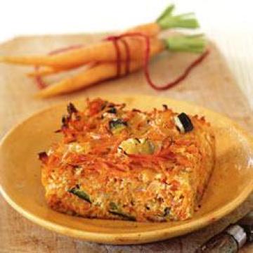 橄榄油1茶匙,大洋葱1个,切碎,大笋瓜(节瓜、翠玉瓜)1根,切丁(0.5厘米见方),盐1/2茶匙,大鸡蛋2个,牛奶60毫升,中等大小的胡萝卜3根,削皮后刨丝,用纸巾抹干,刨成丝的切达(cheddar)奶酪115克,切碎的莳萝1汤匙