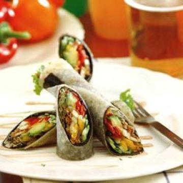 红甜椒100克,去籽切丝,黄甜椒100克,去籽切丝,苜蓿芽(alfafasprouts)100克,洗净沥干,苹果100克,去籽切丝,酪梨(牛油果)100克,去核切条,小黄瓜(青瓜)100克,切丝,素肉松4汤匙(约20克),海苔4张,全麦春卷皮4张,杏仁酱4茶匙,香菜(芫荽)10克,切碎