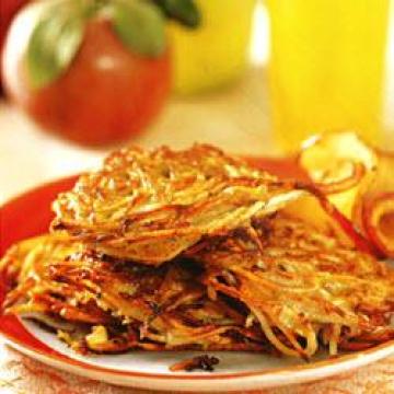 无盐奶油(牛油)2茶匙,苹果2个,去核后切成0.5厘米厚苹果圈,褐皮马铃薯(russetpotato)450克,刨丝后用纸巾吸干水分,中等大小的胡萝卜1根,削皮刨丝后用纸巾吸干水分,洋葱1/3个,切末,大鸡蛋2个,略微打散,中筋面粉2汤匙,盐3/4茶匙,蔬菜油60毫升