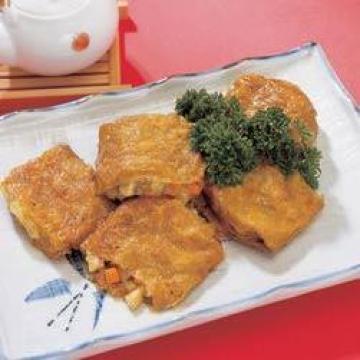 6.油烧热,将腐皮卷炸至香脆金黄,切块上桌即可。