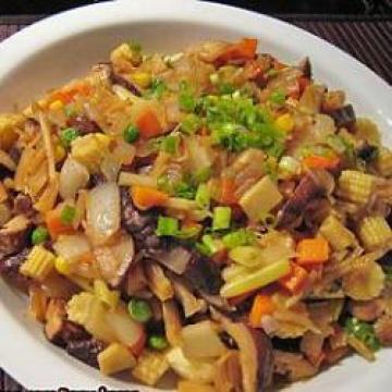 主材:,玉米笋8条,切粒,蒜蓉1汤匙,中型洋葱1个,切粒,冬菇8只,浸软,干扇贝6粒,泡软剁碎,玉子豆腐1条,杂豆140克,汁料:份量仅供参考,水120毫升,蚝油3汤匙,糖1茶匙,麻油2茶匙,腌料:生抽、糖、麻油适量