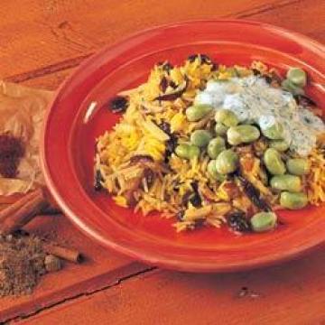 长米如印度香米300克,黄油50克,中等大小红洋葱1颗,大蒜2瓣,香菜(芫荽)末1茶匙,肉桂枝1条,藏红花丝1小撮,无籽葡萄干50克,杏仁片50克,盐、黑胡椒适量,冷冻蚕豆450克,原味酸乳酪150克,香菜(芫荽)数枝,辣味橄榄油2—3汤匙