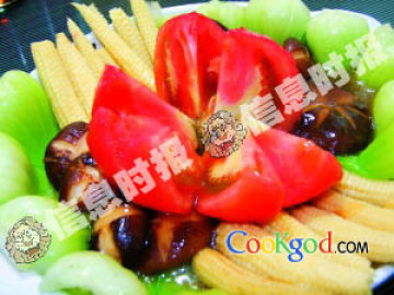 材料:小白菜(12棵)、玉米笋(14根)、香菇(4朵)、番茄(1个)