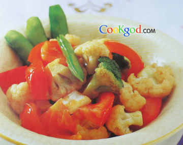 西兰花、菜花各100克,草菇、豌豆荚、洋葱片、番茄各80克。蒜末、糖、蚝油、鱼露各适量。