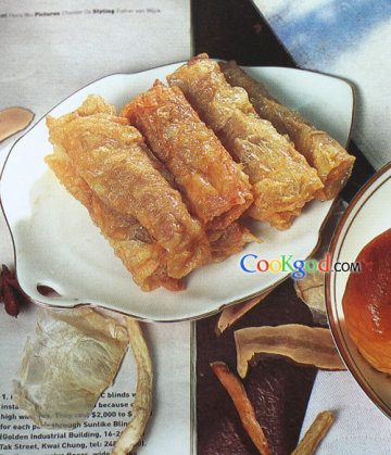 3、鸡蛋磕人碗内,加适量面粉搅成糊;豆腐皮泡软铺在案板上,把素馅抹在豆腐皮上卷起来,用蛋糊封好口,成“千子”状。
