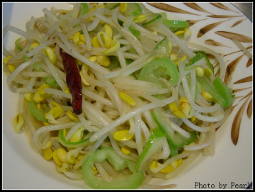 黄豆芽半斤、灯笼青椒1-2只、干辣椒4颗、盐、糖、白醋。