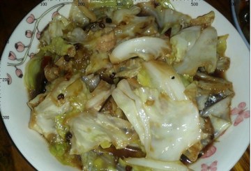 2、生猪油块熬到金黄色,放入干辣椒、花椒爆香;放入包心菜翻炒;放入盐适量翻炒;加入陈醋、糖翻炒后加入味精适量,装盘即可。