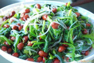 2、花生米与油放冷锅里,炒熟,闭火,把菠菜、粉丝倒入,加盐拌匀即可。