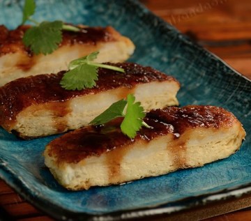 4) 照烧汁用微波炉高火叮半分钟至热,均匀刷在素鳗两面,豆包面朝下静至10~15分钟,使素鳗吸透汁水;