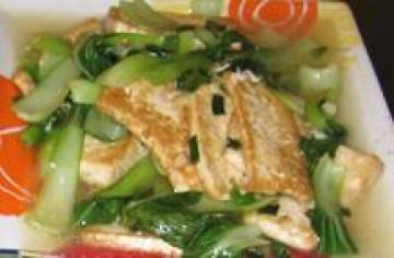 老豆腐一盒,生粉,葱花,姜丝,蒜蓉(1.5茶勺),小青菜,盐3/4茶匙,鸡汤1/2杯